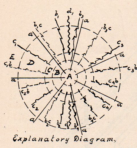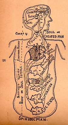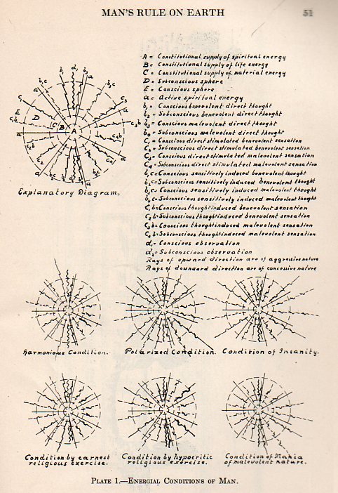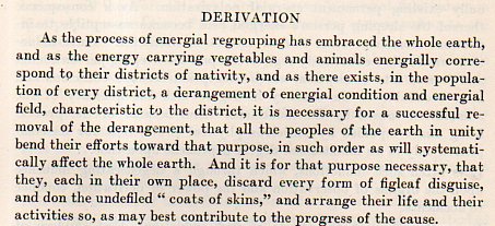 This is a long passage, but I include it because, well, I just had no idea when an abrupt turn was going to be made in the discourse; nor did I have any idea of what the principles were of what was being discussed. And this is still all on page one. Sometimes passages like these are breathtaking, as in leaving you without breath, because their foundation for understanding is so elusive. All you’re left with, sometimes, is a “wow!” reaction, like appreciating a pitcher who has just struck you out on three roughed-up-greasy-spit-laden nastiness pitches that were invisible and illegal, and didn’t matter at all.(What the figure in the cover illustration is saying. by the way, is "Ether air motions creates cell activity", with a couple of Biblical references, somehow.)