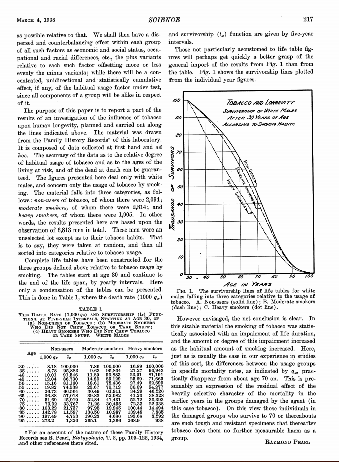 "Despite his often provocative pronouncements, the proof that Pearl provided that smokers are prematurely killed by the effects of tobacco must be recognized as one of his most important achievements in epidemiology. In fact, Pearl’s 1938 article in Science describing the premature death of smokers was the first significant piece of data on the link between tobacco and longevity."--Goldman, I L, “Raymond Pearl, smoking and longevity”, in Genetics, 11/2002, Volume 162, Issue 3 https://www.genetics.org/content/162/3/997