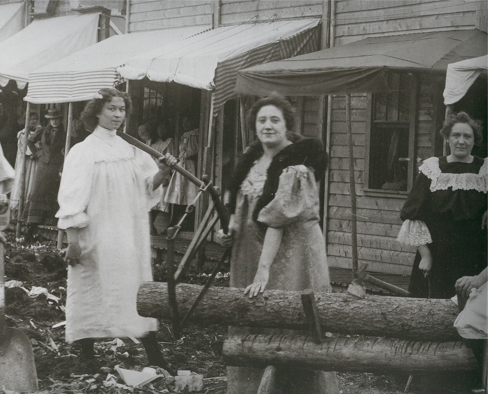 This is a detail from a photo seen in Pierre Berton's The Klondike Quest (a big, beautiful book of high rank for a popular history, interestingly published with a more shouty title in America as Klondike Fever) showing the working women of Dawson working at other trades. I particularly like the picture of the high-collared white-dressed angel-woman witht he axe on her shoulder...and the woman behind her, under the make-shift cloth awning, her hat tiled forward and her hand jauntily on her relaxed hip.