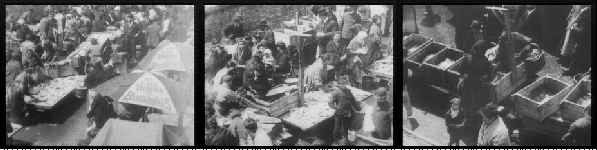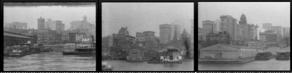 From the LOC site: "This film depicts the East River shoreline and the piers of lower Manhattan starting at about Pier 5 (the New York Central Pier) opposite Broad Street, and extending to the Mallory Line steamship piers just south of Fulton Street and the Brooklyn Bridge. The film begins with shots of canal boats or barges (from the Erie Canal via the Hudson River) docked at and around Coenties Slip [Frame: 0106]. As the film progresses, the New York Produce Exchange located at Bowling Green, Manhattan, with its distinct tower, comes into view in the background [0346]. Between here and the Wall Street ferry, there follows in order of appearance: steam tugs [0308 and 0422], a wooden hull barkentine [1032] with box barges alongside, a docked iron hull sailing ship, probably British [1448], an ocean steamer with yards on the foremast [1748], a derrick lighter laden with barrels docked at the end of a pier [2134], and a fruit steamer [2612]. In the Wall Street Ferry slip (between Piers 15 and 16) there is a Wall St., Manhattan-to-Montague St., Brooklyn, double-ended steam commuter boat [2896]. The ferry is visible immediately before a shot of the large advertising billboards on Pier 16. The film next shows the Ward Line piers (J.E. Ward & Co., New York and Cuba Steamship Co.) [3040], a Pennsylvania Railroad tug [3190], a derrick lighter [3320], and the Mallory Line piers [3692]. A Mallory Line steamer can be seen on the south side of one of the Mallory Piers [3736]. The camera begins panning out into the East River after passing pier 20, catching the fog bell at the end of pier 21 [3922]. A car float is visible passing under the Brooklyn Bridge [4202]. The pan follows the line of the Brooklyn Bridge eastward to Brooklyn Heights, where the Hotel Margaret (tall building in background) is visible just before the end of the film [4464]. This film continues the view begun in the film Sky Scrapers of New York City From the North River. Together they comprise a sweep around the southern tip of Manhattan, from Fulton Street on the Hudson to the Brooklyn Bridge."