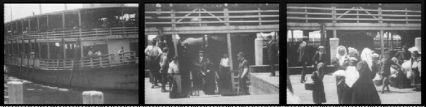 From the LOC site: "The film opens with a view of the steam ferryboat "William Myers," laden with passengers, approaching a dock at the Ellis Island Immigration Station. The vessel is docked, the gangway is placed, and the immigrant passengers are seen coming up the gangway and onto the dock, where they cross in front of the camera."