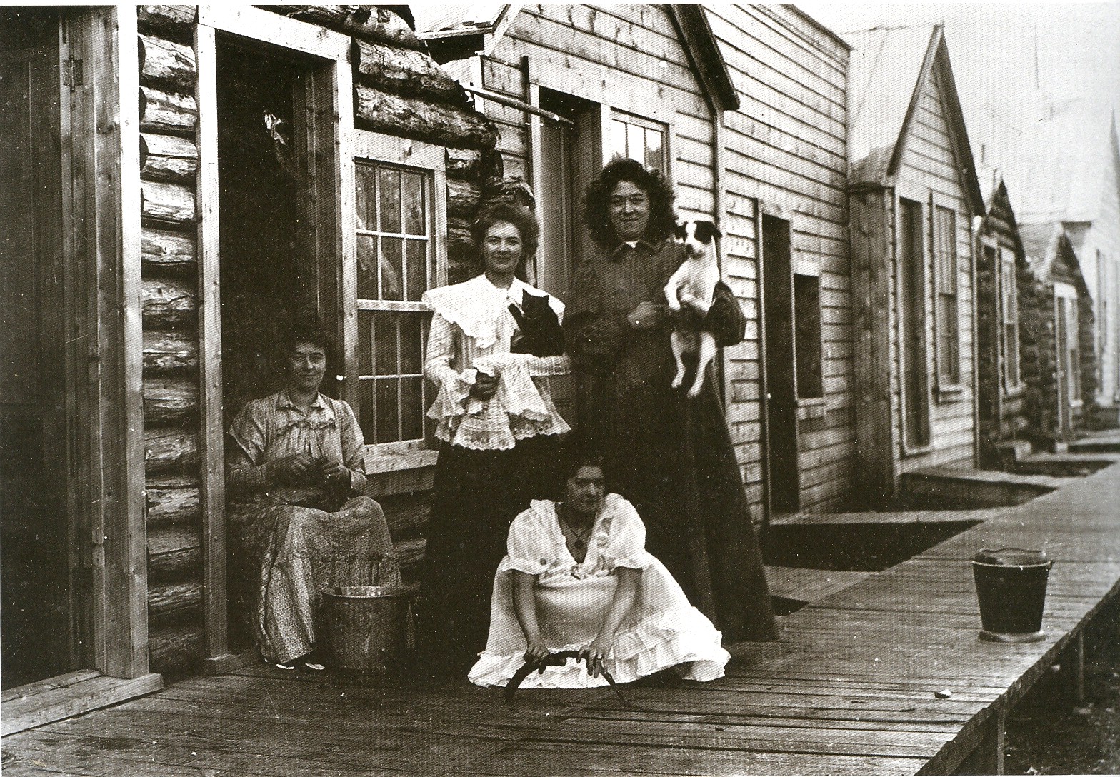 One service to humans that was ably met was sexual, filled by legions of prostitutes, some of whom arrived in the Klondike of their own free will, and others, not. This photo, made near Dawson, shows "Paradise Alley" (behind front street) an almost-overnight series of rough-hewn log bungalows sweatily constructed for lonely needs. There were evidently 70 of these little huts, all in a row, each with the woman's name above the door, presumably rendered in chalk. (It seems that the photos I've seen of women in the Klondike show many smiles, but no toothy ones.)