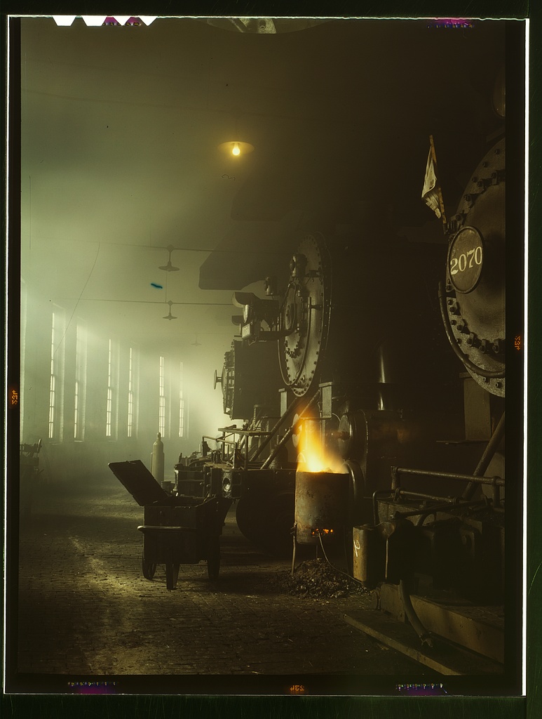 This magnificent photograph was made by Jack Delano (1914-1997) while working for Roy Stryker at the Farm Security Administration agency (FSA). It is called "C & NW RR, Locomotives in the Roundhouse at Proviso Yard, Chicago, Ill.", and was made in December 1942. This has long been one of my favorite images in the FSA color archives.