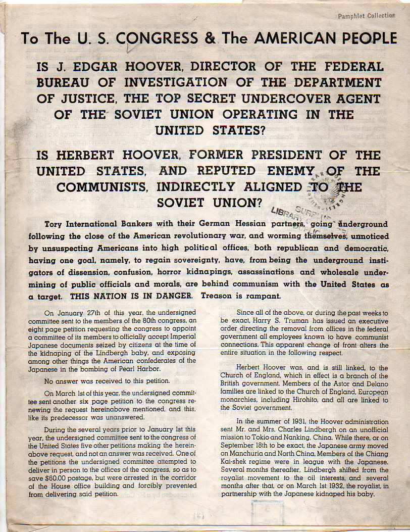 My copy of this document was once owned by H.L. Mencken, who gave the thing to the Library of Congress, which in turn decided it wasn't worth having around (at least in duplicate). I don't need to own it either, though as a piece of quiet-ish political junk it should be somewhere to remind people that even in flaming propagandistic rhetoric there's more reading to be done between the lines.