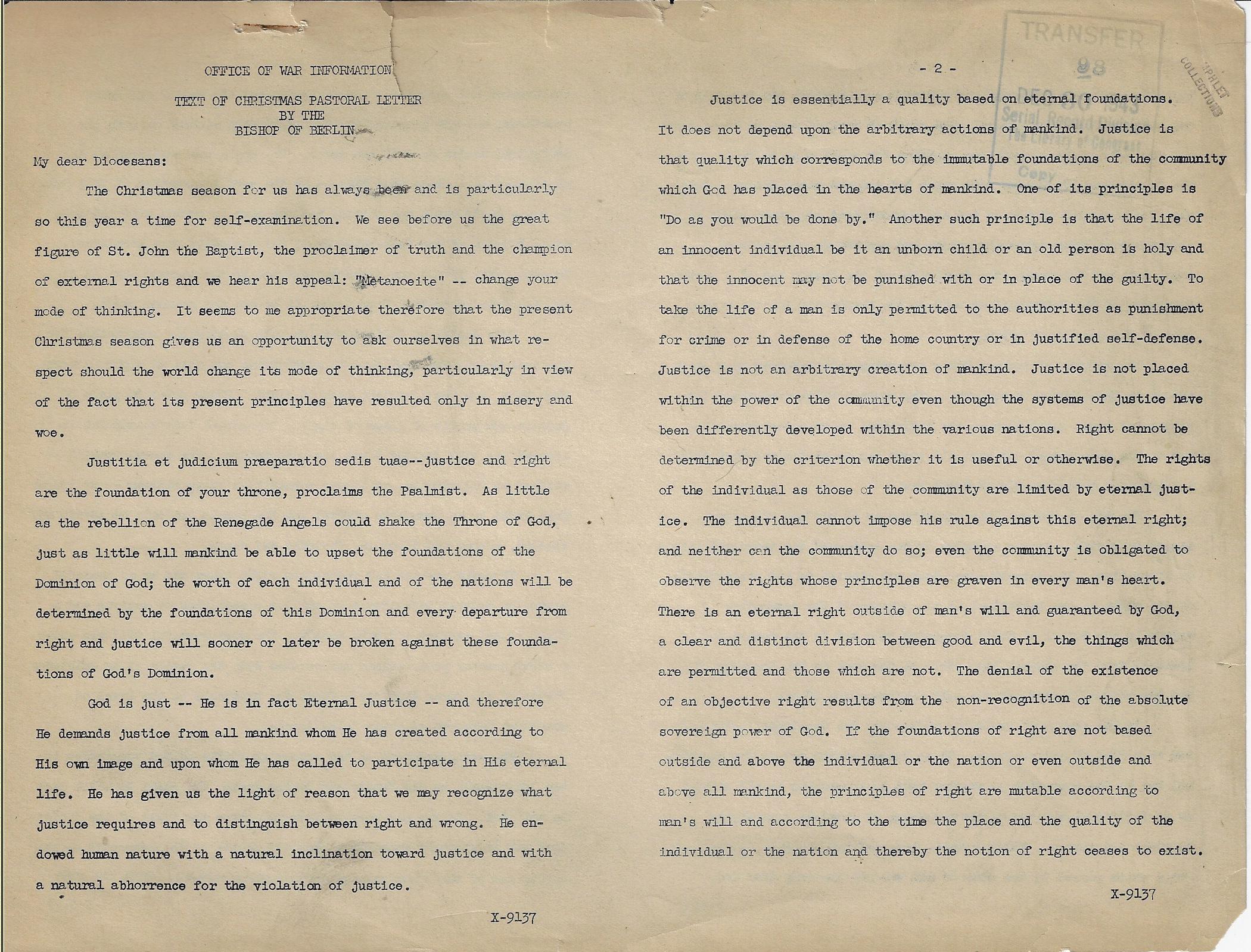 I tried to find the text of this sermon by Dr. C(K)onrad Graf von Preysing1, Bishop of Berlin, for December 12, 1942 online but could not--there was a much more famous address made by Pope Pius at about the same time (which was much longer and well worn in history), but so far nothing for the von Preysing. So, since I have a reprint of it right here (made by the U.S. Office of War Information) I'll just present the very short document here. At this point in the war, int eh winter of 1942, Hitler and the Nazis were on the other side of the height of power, the efforts in the East becoming the total defeat that had been awaiting them for most of the year, and the surrender of what was left of the decimated 6th army just weeks away. But there was still another 2.5 years before the final downfall, during which many millions of people will be murdered and killed. So, making such comments in Berlin in the winter of 1942 was still very dangerous, and Bishop von Preysing was a courageous man.
