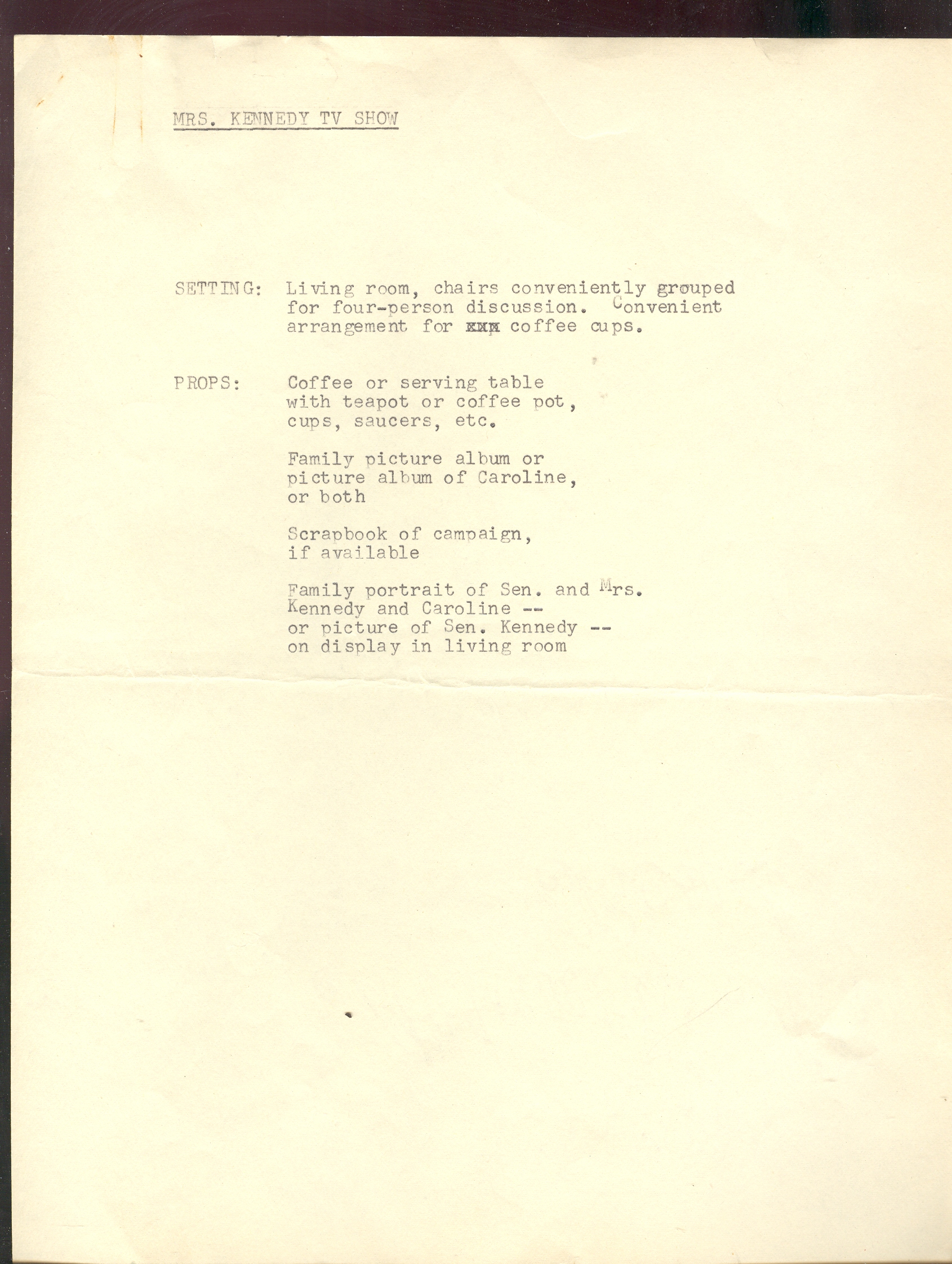 VIDEO (pg 5): "suggested to close program: if there is a family picture, or a picture of Senator Kennedy in the room, someone might draw attention to what a good picture it is. Mrs. K could either bring it in closer or rise and walk over to it. Women would then continue in conversation, silent footage, while the announcer concludes the show, voice over."