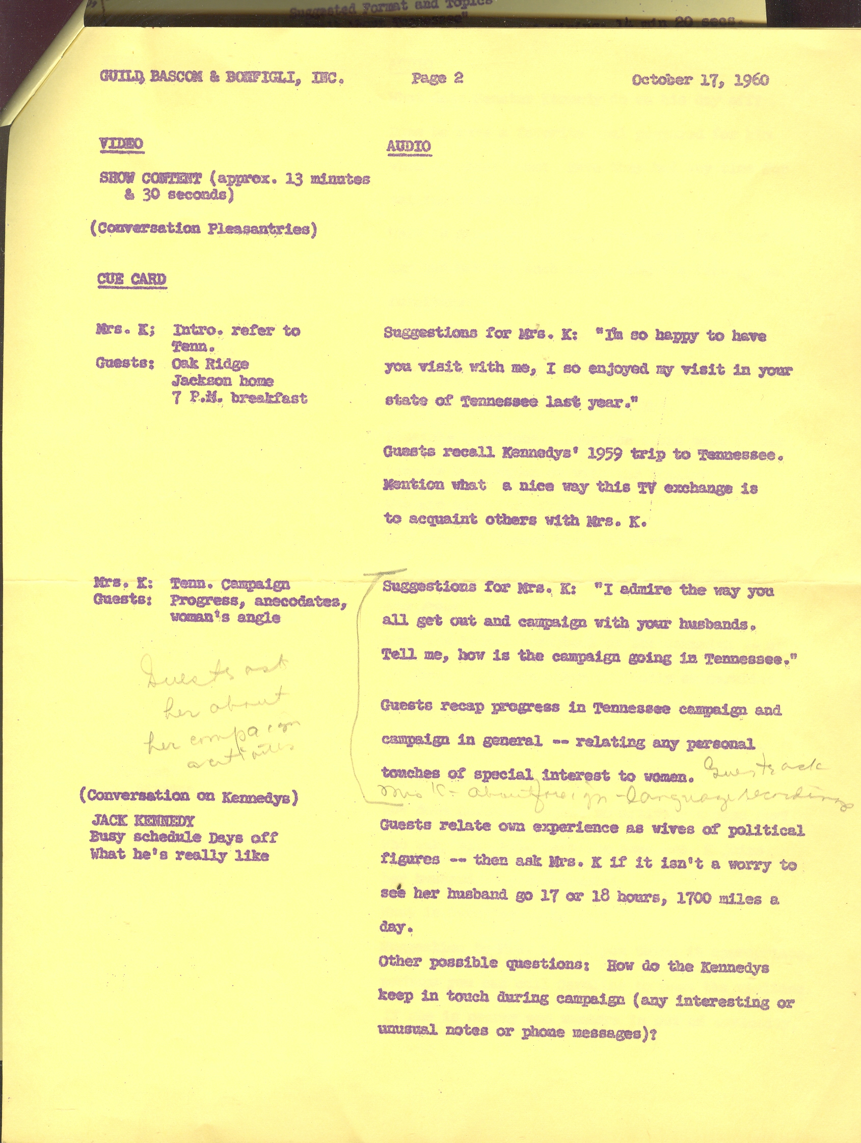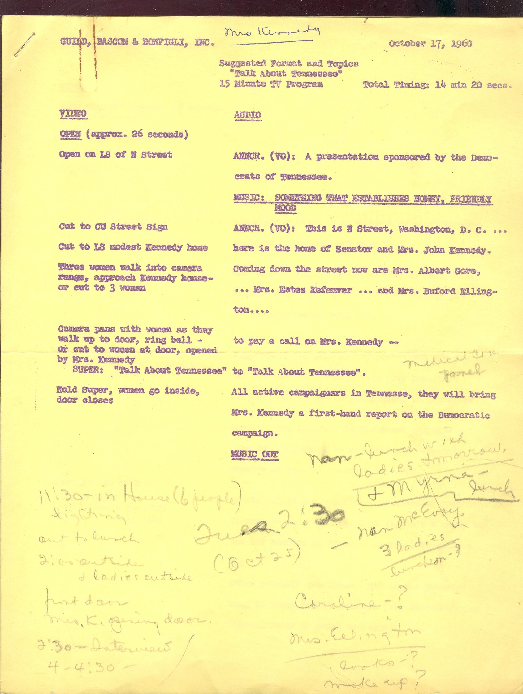 The document, purple ink printed on yellow paper, and was evidently produced by Guild, Bascom and Bonfigli, Inc., and dated 17 October 1960, and is inscribed (in Uhl's hand) "Mrs. Kennedy" in ink at top center of the document. It details the look, feel and sound of the "TV show", and also has suggestion about the content of the conversation. There are outlines for conversation *only* as there appears not to have been a definite script for each of the women. The entirety of the show does seem to be here, though, directing how the show should look to the viewer. The document is essentially divided into two sections, left and right, one side describing the video segment and the other describing the audio. A sample as follows: