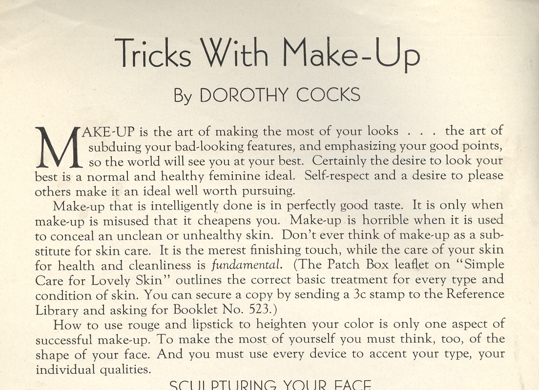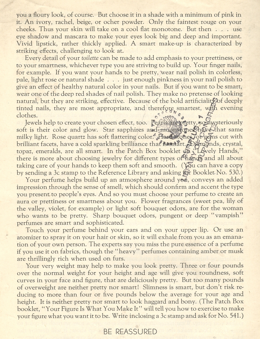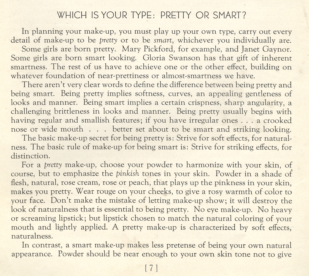There's much to learn about what was expected of the social shell of women in this pamphlet, but what I've focused on is this jewel on page 7: "Which is Your Type: Pretty or Smart?" And that's it: no ground in-between, no space for something else, and evidently no room for being smart AND pretty. Here it is: