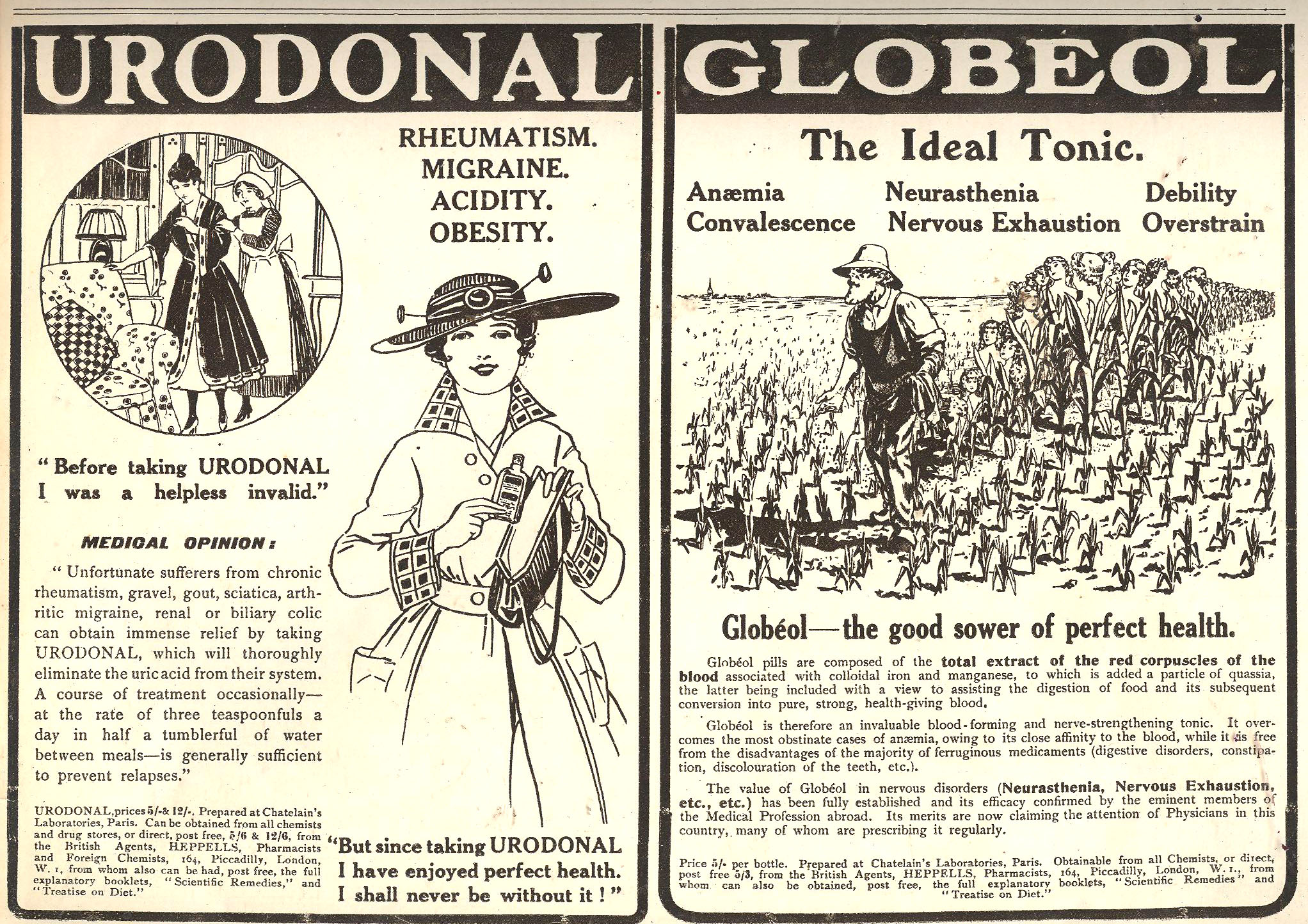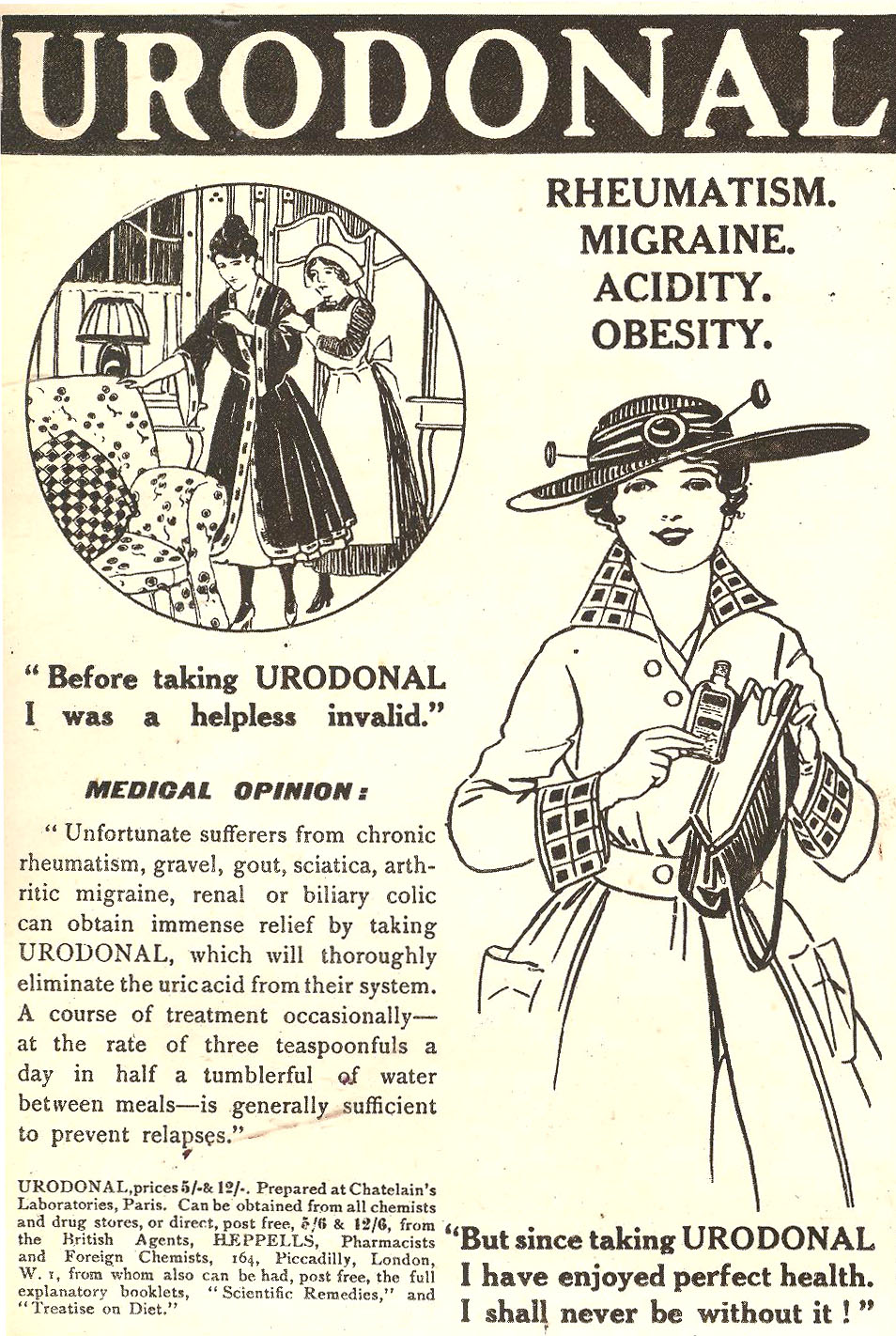 Urodonol was a product in long use in Europe and England, a quack medicinal of little harm that plagued the hopes of people with aliments elusive to medical detection, especially that of the greatly secret ennui and fatigue in response to sexual relations. It claims to have cured rheumatism, migraine, acidity, gravel, gout, sciatica, arthritis, biliary colic and of course obesity, all taken care of with teaspoons and thimbles. The most that it did perhaps was to not cause any of these aliments. But it did paint a picture of the failing, fainting woman being restored to stature so common to the pages of advertisement in The Illustrated London News (this issue for 5 June 1920). Pre-Urodonol the lady is being assisted by the nurse to the well-pillowed fainting coach--"ahh" she says, her arms outstretched looking for balance, faking a tottering in her high heeled shoes. The coach was a step away.