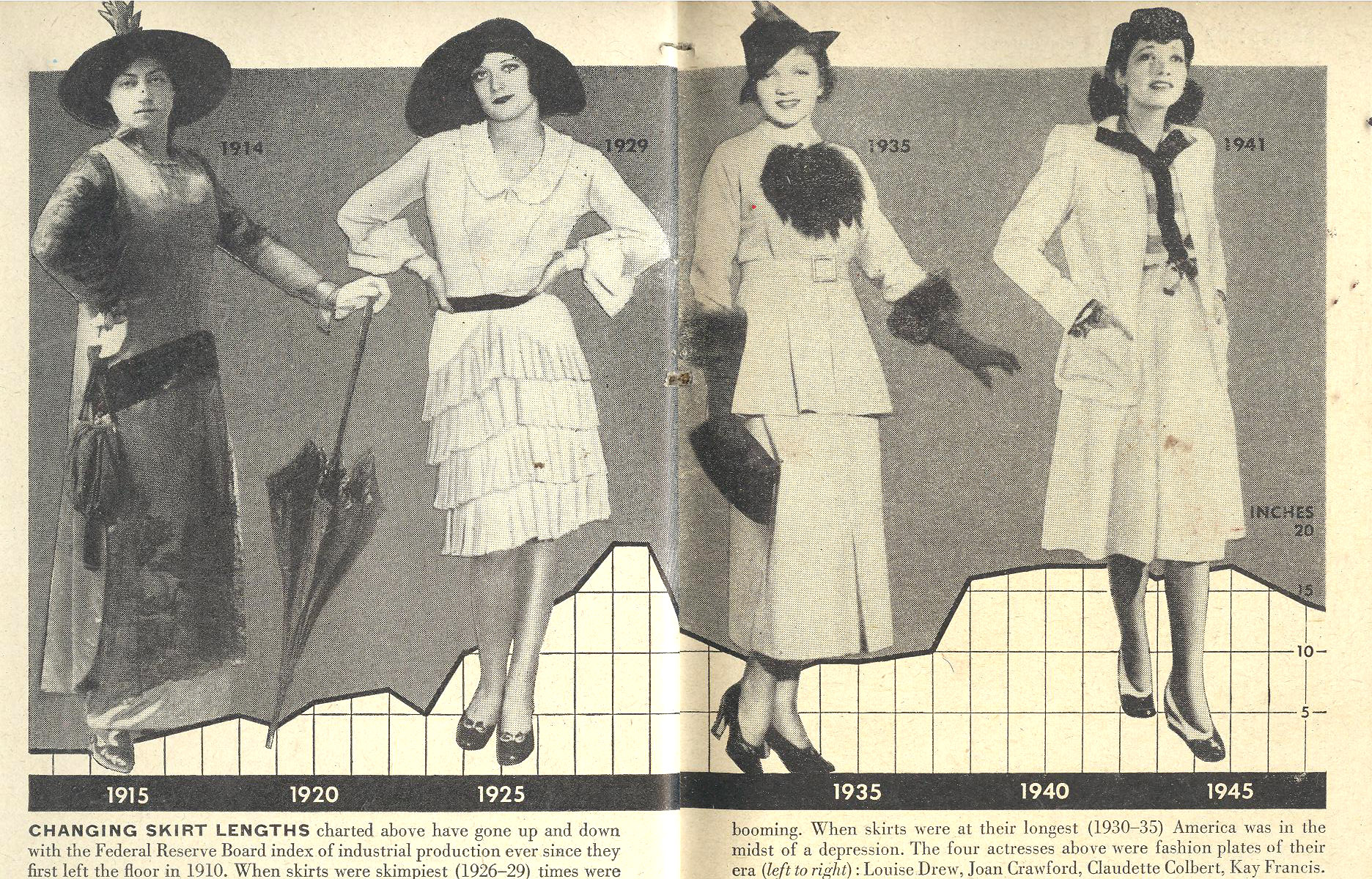 This graph illustrating the history of skirt lengths in the United States is oddly interesting and appealing, a job well done. I like that the graph lines fairly well reveal the amount of leg shown by the rising and lowering hemlines, measuring the height above the ankle from bottom to top.