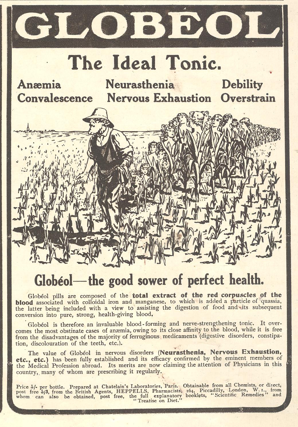 Curiously the ad next to this one--same size, same typeface--is for another quack medicine for men whose seed is evidently growing moldy in the bottom of their sowing sack. Globeol addresses the keyword problems for sexual malaise: "debility, overstrain, anaemia, nervous exhaustion" by "conversion into pure, strong, health-giving blood". Lest the use of STRONG BLOOD PURE BLOOD-FORMING HEALTH-GIVING GOOD SOWER be lost there is always the Johnny Appleseed person above, casting about his seed, growing children instantly.