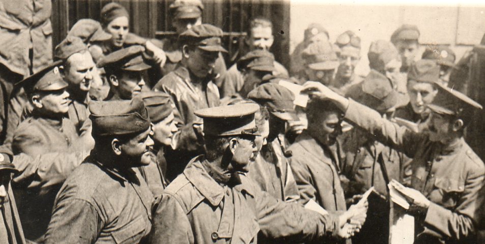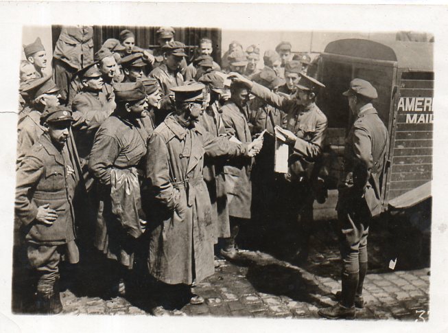 Mail Call, end of 1918. Original photograph. 6.5x4.5 inches. Fine condition, save for one short teat of about a half-inch in the left margin extenbding very sliughtly into the image. $175