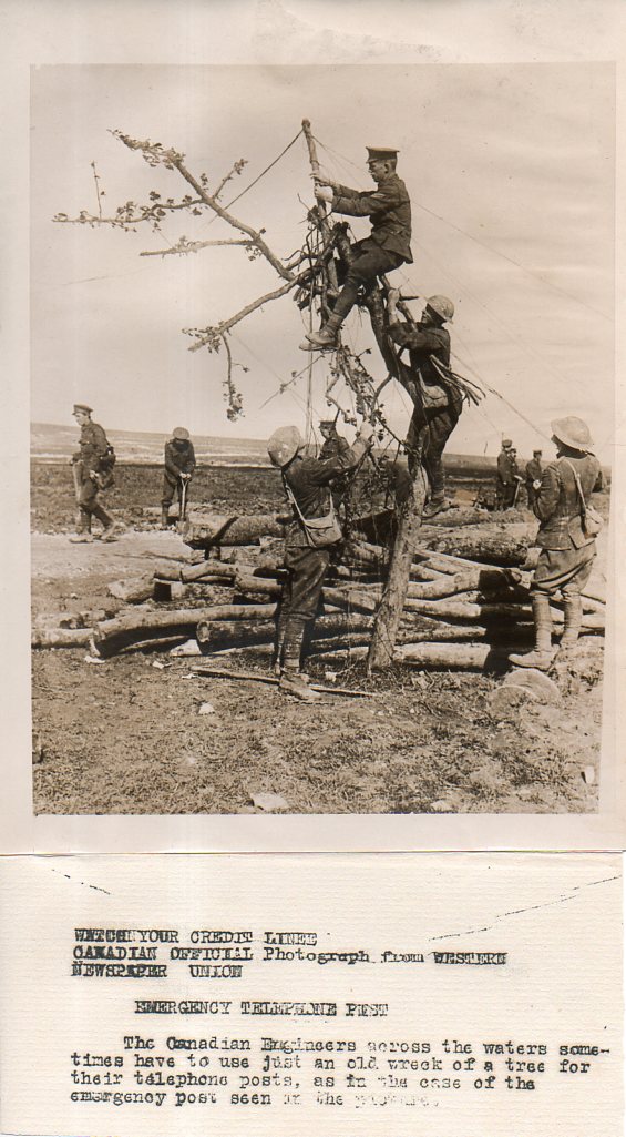 During World War I battlefields that began as forests ended as plains. And since telephonic communications depended upon wires, and since the wires needed to go somewhere, anything that survived that was head-and-shoulders above the ground was of particular use, especially to the telephone corps and especially for the use of telephone wires. This news service photo (provided by the Western Newspaper Union) shows a rather desolate scene, with Canadian engineers working the wreck of a lone tree for all it was worth...as is plainly visible, there is nothing else like it in the near or remote vicinity.