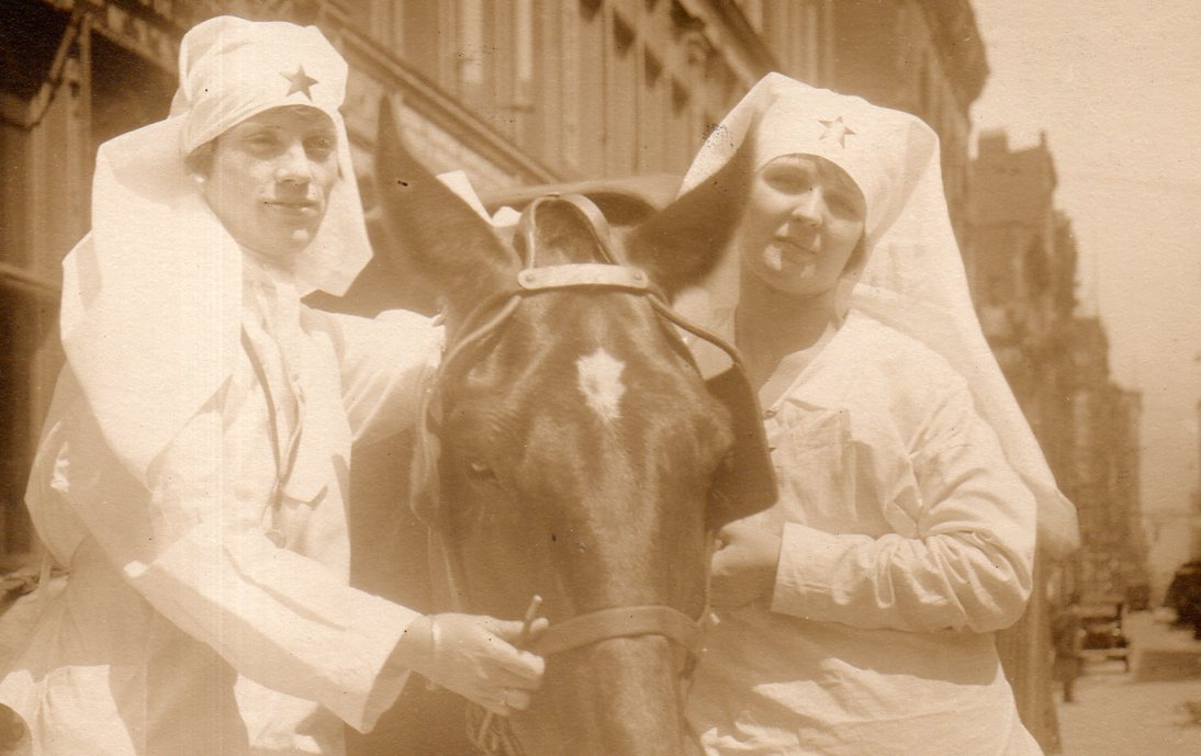Image of three women as volunteers--the woman in the foreground is actually standing even though it looks as though she is kneeling; the other two women are standing on trash cans to get the upper hand on the horse. This is a simple and lovely image.